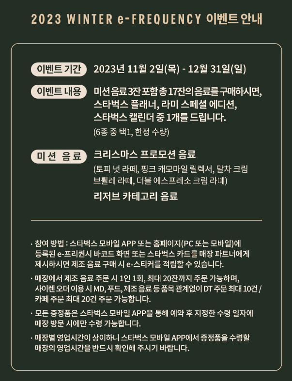 - 방법 : 미션 음료 3잔을 포함해 총 17잔 음료를 구입하면 리워드(상품) 제공