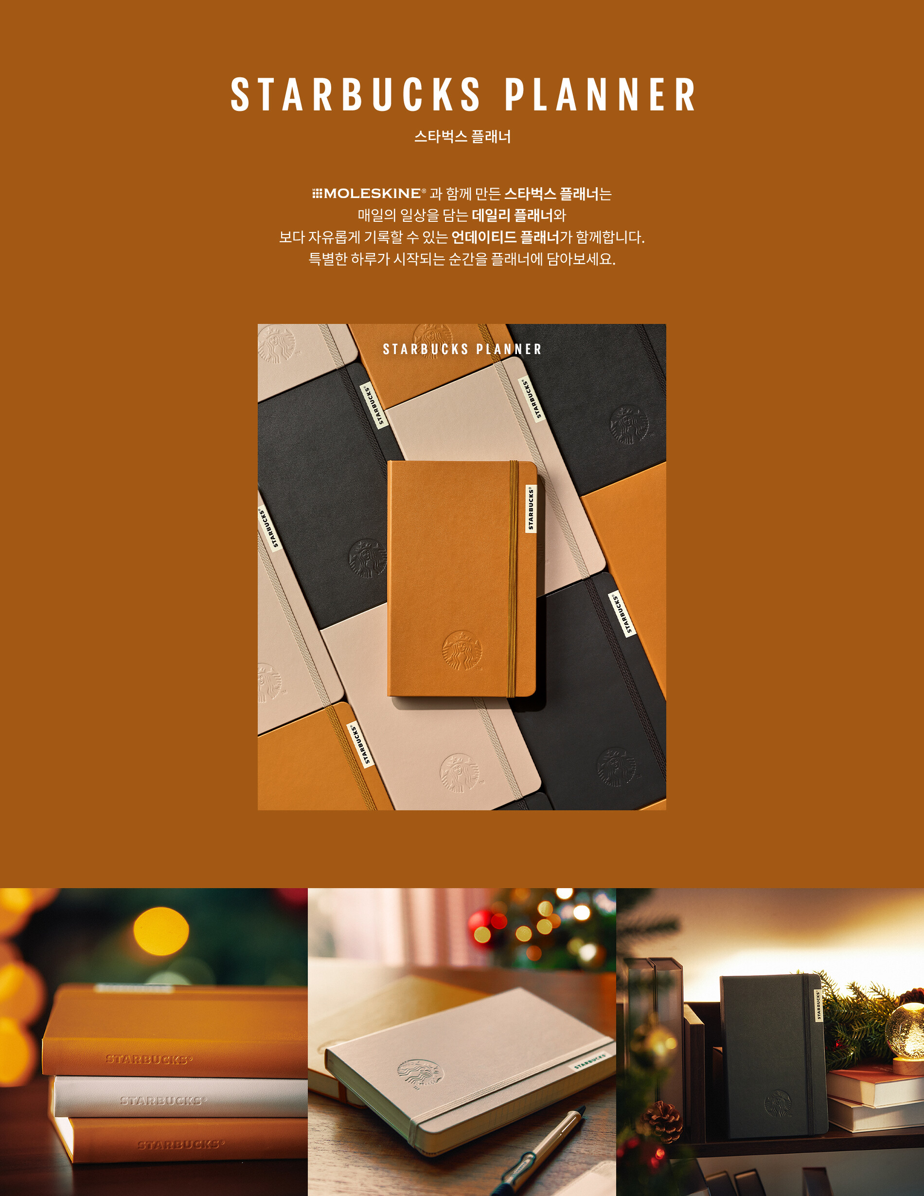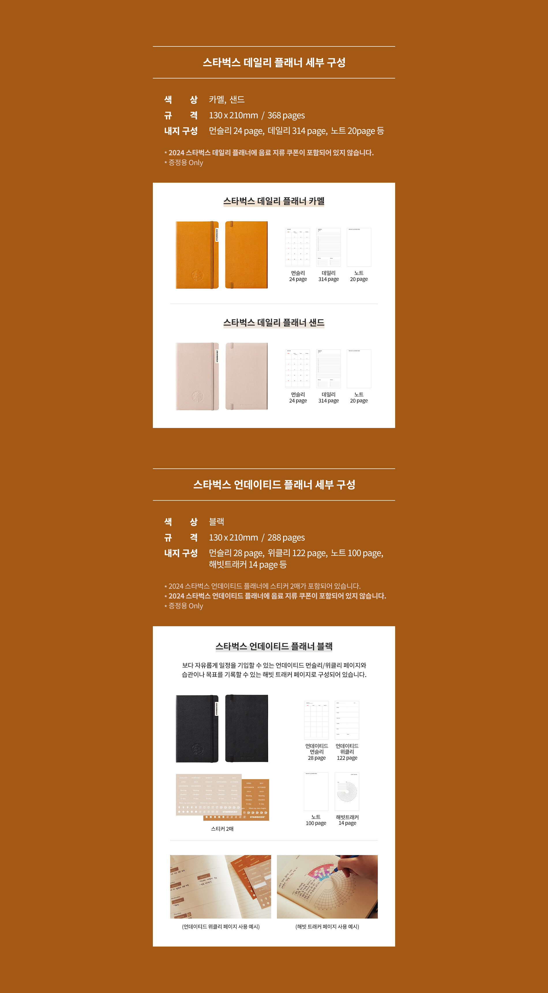 | 스타벅스 데일리 플래너 | 카멜, 샌드 | 130 × 210mm | 368p | 먼슬리 24p, 데일리 314p, 노트 20p |